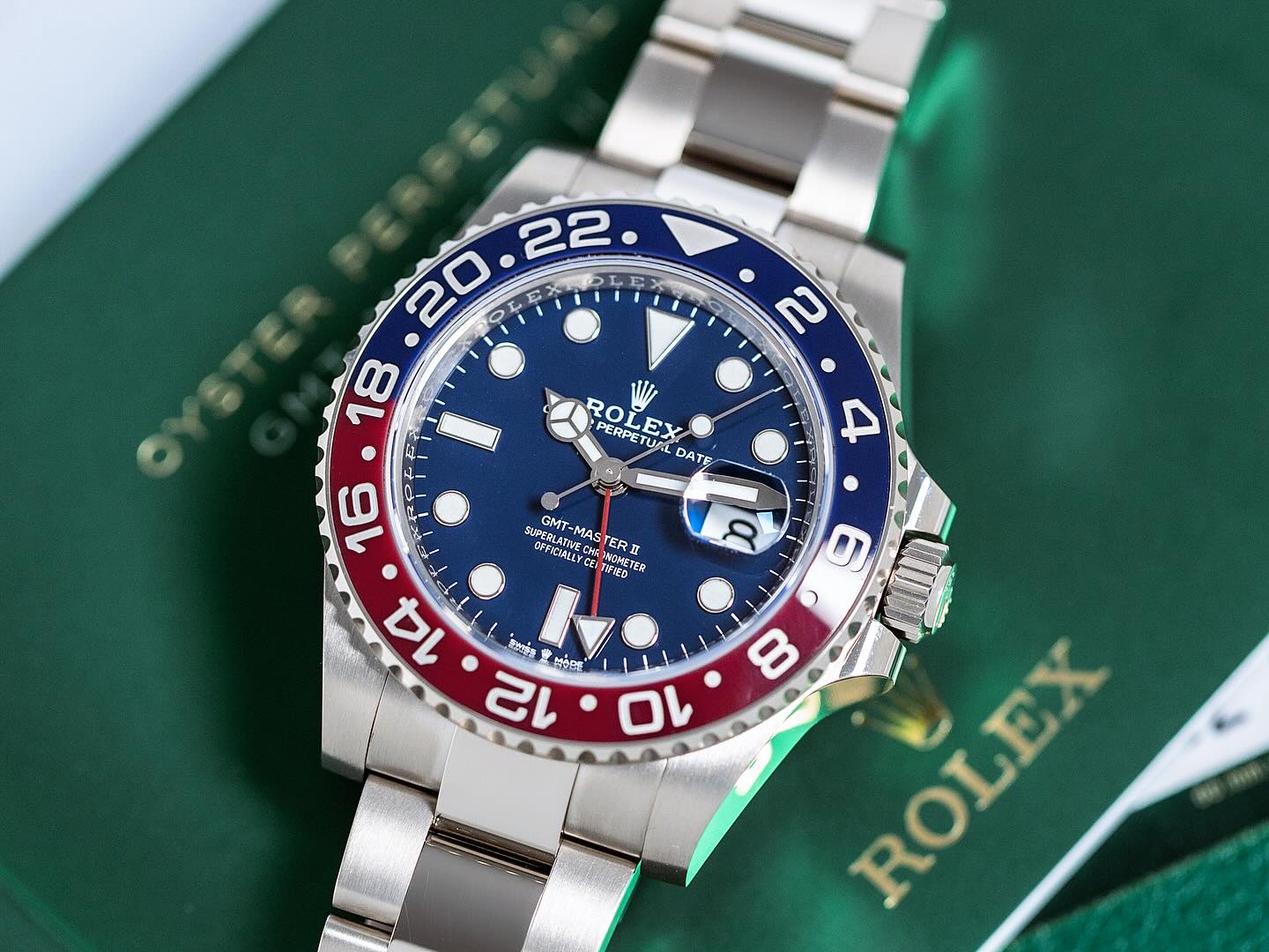 Its red and blue Cerachrom bezel, known as the "Pepsi" bezel, allows seamless tracking of two time zones.